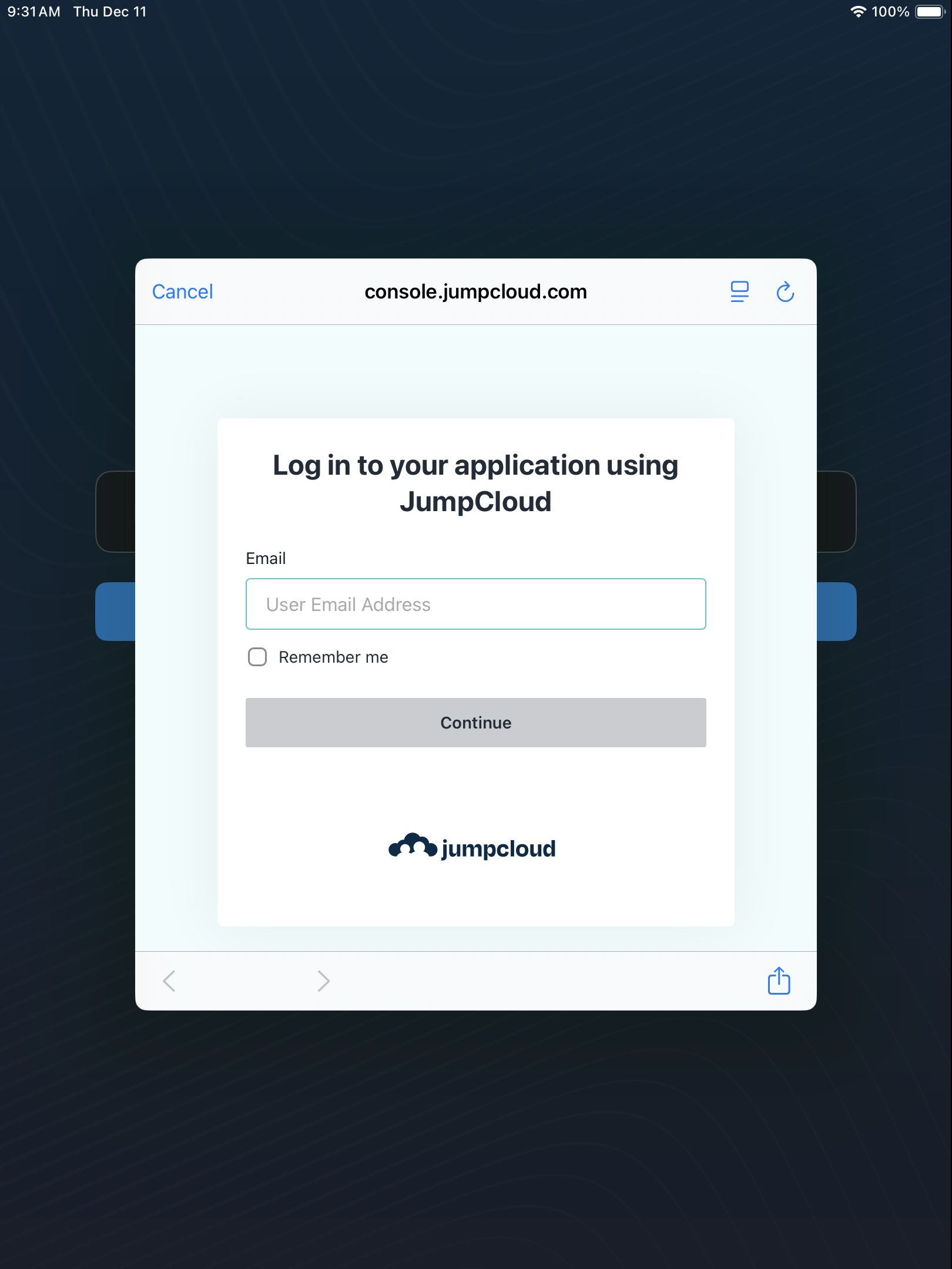 - Enter your JumpCloud email and tap Continue